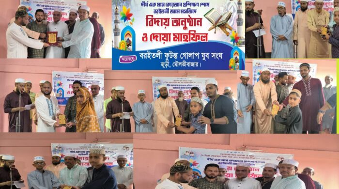 মৌলভীবাজারের জুড়ীতে ফুটন্ত গোলাপ যুব সংঘ বরইতলী কতৃক আয়োজিত দীর্ঘ এক মাস সহী শুদ্ধ কুরআন প্রশিক্ষণ শেষে বিদায়ী শিক্ষক ও শিক্ষাথীদের মধ্যে পুরস্কার বিতরণী ও সমাপনী অনুষ্ঠান সম্পন্ন হয়েছে।