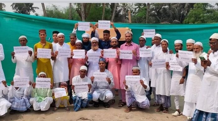 সকালে দক্ষিণ চব্বিশ পরগনা জেলার মগরাহাট পশ্চিমের ঘোলা নওয়া পাড়া ও বাহির গাছি গ্রামে ঈদুল ফিতরের নামাজ বাদ ওয়াকাফ সম্পত্তি দখল নিয়ে প্রতিবাদ জানান মুসলিম উম্মাহর শান্তি প্রিয় মানুষ। এই প্রতিবাদ সমাবেশে মহিলারা হাজির ছিলেন।