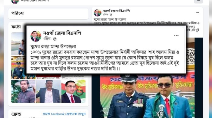 সামাজিক যোগাযোগ মাধ্যম ফেসবুকে নওগাঁর মান্দা উপজেলার উপজেলা নির্বাহী কর্মকর্তা শাহ আলম মিয়া ও মান্দা থানার ভারপ্রাপ্ত কর্মকর্তা (ওসি) মনসুর রহমান কে ঘুষখোর এবং ঘুষ দিলে কলম চলে আর ঘুষ না দিলে কলম চলেনা এমন বিষয় উল্লেখ করে “নওগাঁ জেলা বিএনপি” নামক ফেসবুক একাউন্ট থেকে করেছেন পোস্ট।